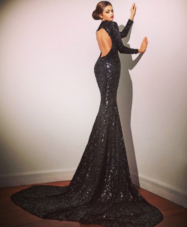 Custom gown created by Henry Spencer. Features elaborate sequin detail, open back, and exaggerated train. Perfect for a red-carpet event.